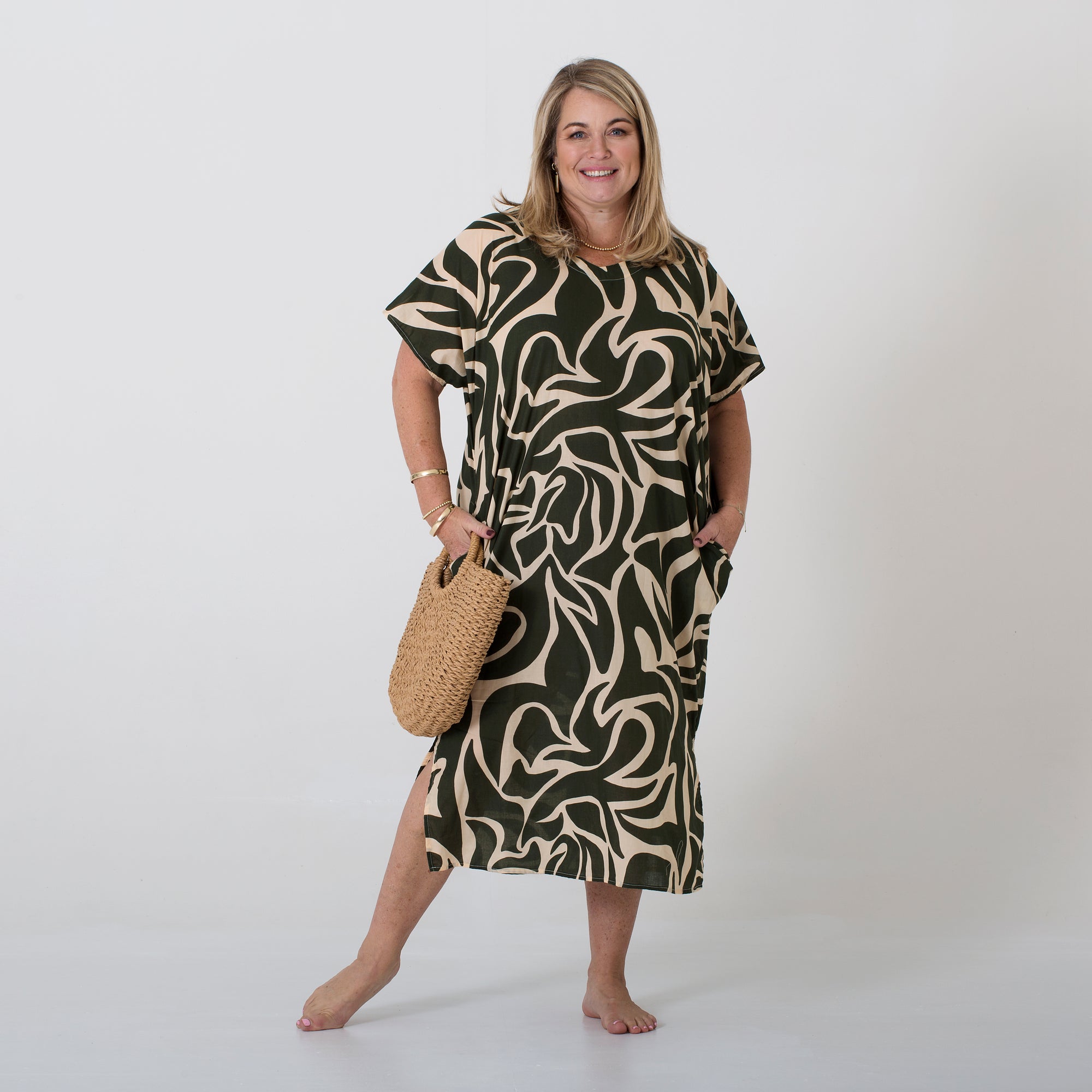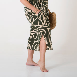 The Como Kaftan embodies effortless Positano elegance in this gorgeous olive and cream print. Made from soft, breathable cotton voile, it drapes beautifully over the body, keeping you cool and comfortable in warm weather. Gentle side slits allow for easy movement, while discreet pockets add everyday practicality. Relaxed, timeless, and endlessly wearable - it’s the perfect piece for relaxed luxury living.
